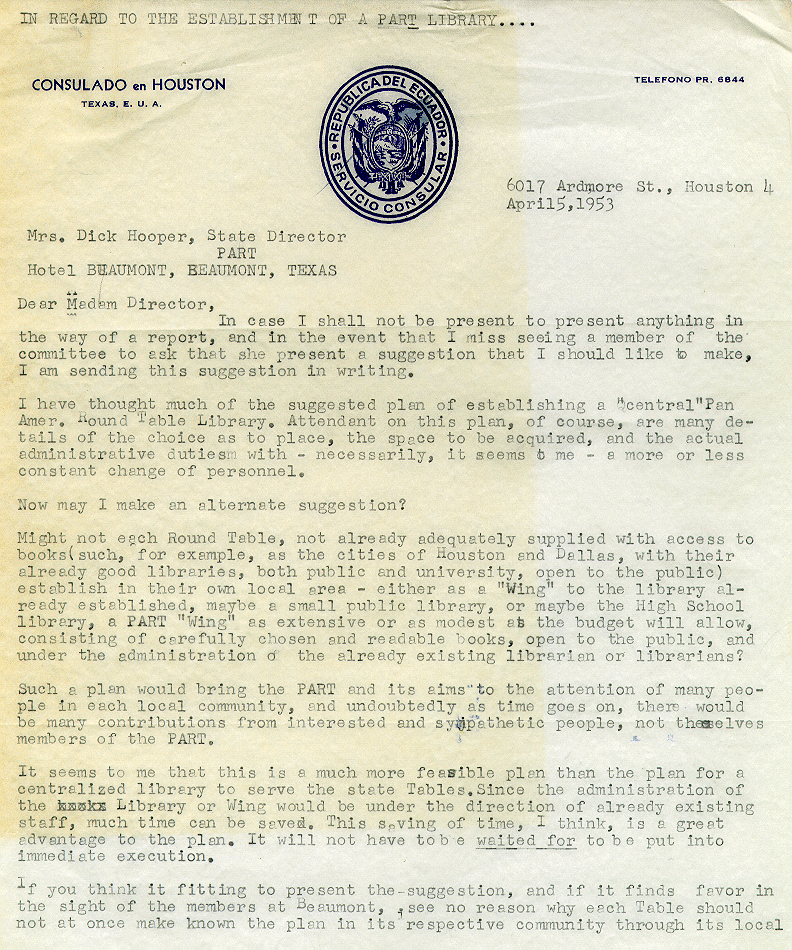 Library Committee Recommendation for a "PART Library" made at 26th PARTT Convention, April 8-10, 1953 in Beaumont, Texas